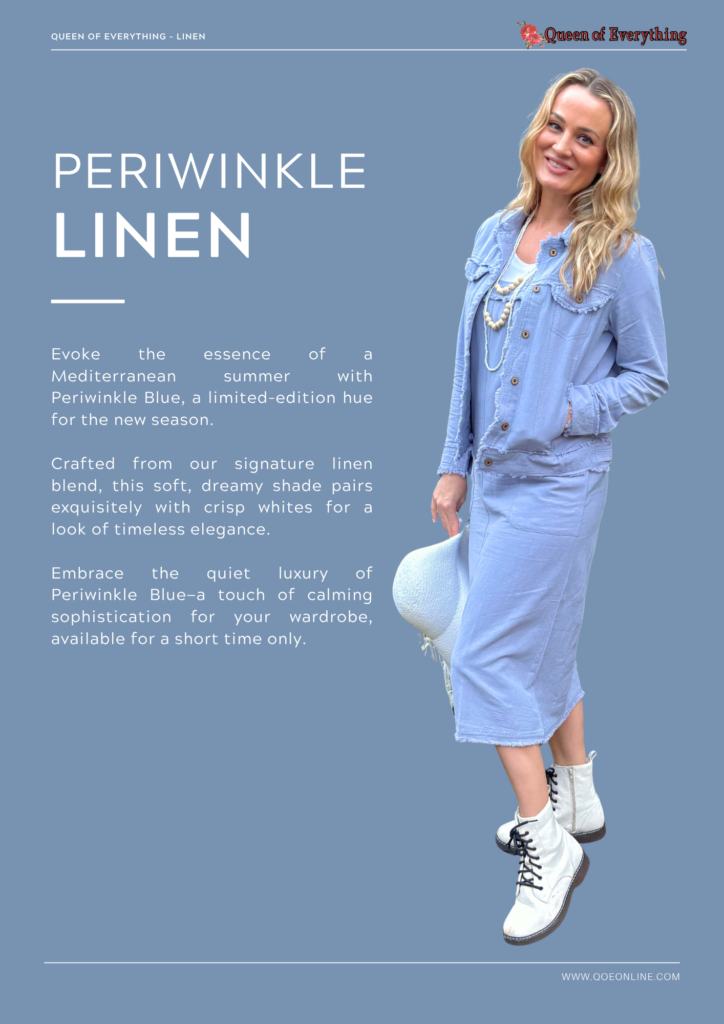 Embrace the quiet luxury of Periwinkle Blue—a touch of calming sophistication for your wardrobe, available for a short time only.