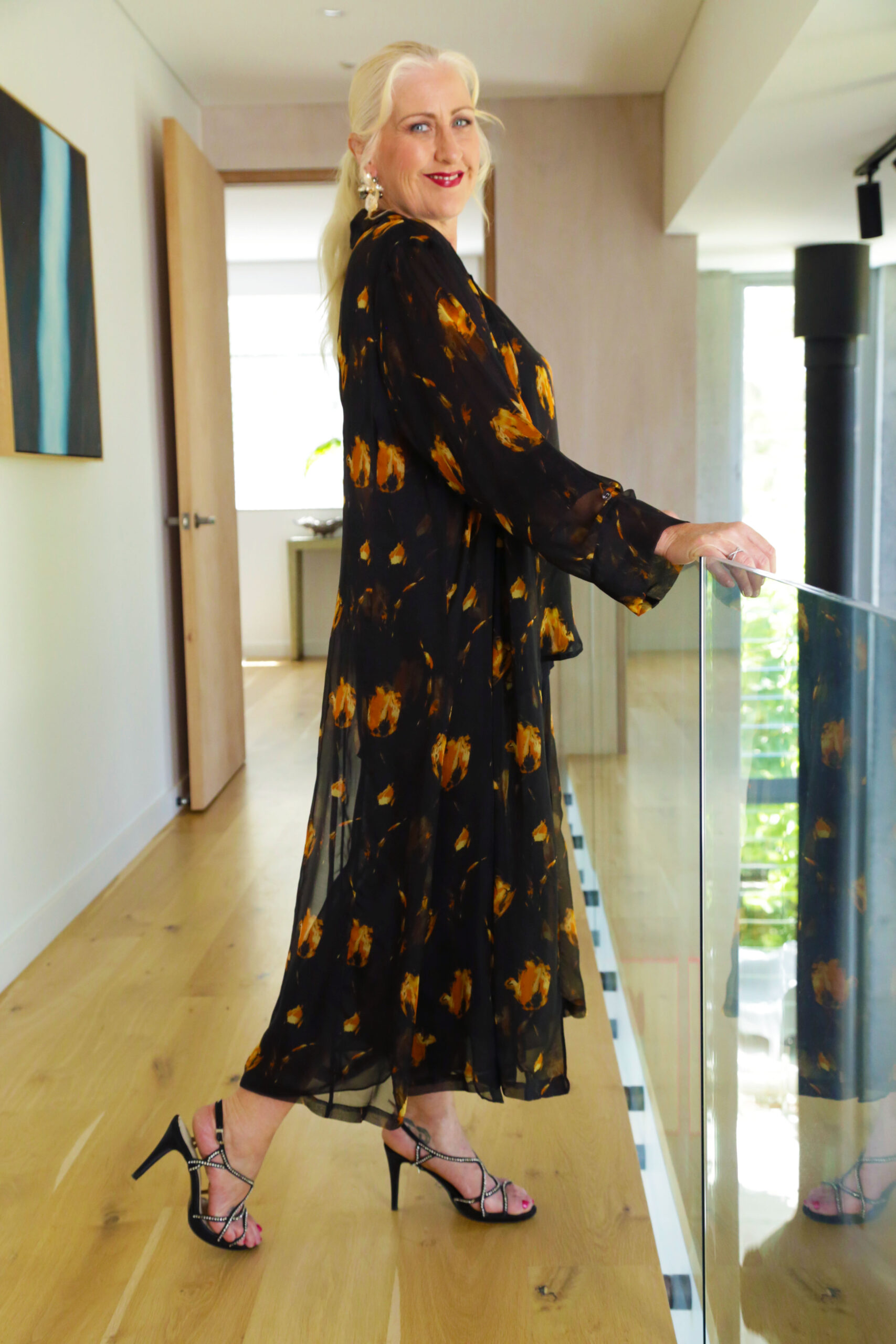 The Black Tulip Duster Coat is a love letter to timeless style with a rebellious streak—inky black chiffon scattered with painterly tulips in buttercup, mustard, and warm ochre. Each bloom is an abstract brush stroke, spaced to flatter and illuminate, bringing depth and movement to your look without overpowering it.