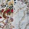 This fabric features a soft cream base adorned with an intricate floral and ornate pattern. The design includes vibrant red and yellow flowers, complemented by green leaves and elegant gold and brown scrollwork, adding a touch of sophistication. The material is lightweight with a smooth, silky texture, offering a luxurious drape that flows beautifully. Perfect for creating elegant dresses, scarves, or decorative pieces, this fabric exudes timeless charm and refinement.