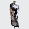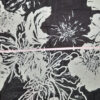 This fabric features a bold black base adorned with striking white abstract floral and leafy patterns, creating a dramatic and modern aesthetic. The material is lightweight and slightly sheer, offering a soft and smooth texture that drapes effortlessly. Perfect for kaftans, dresses, or statement pieces, this fabric combines elegance with a contemporary edge, making it a versatile choice for stylish creations.