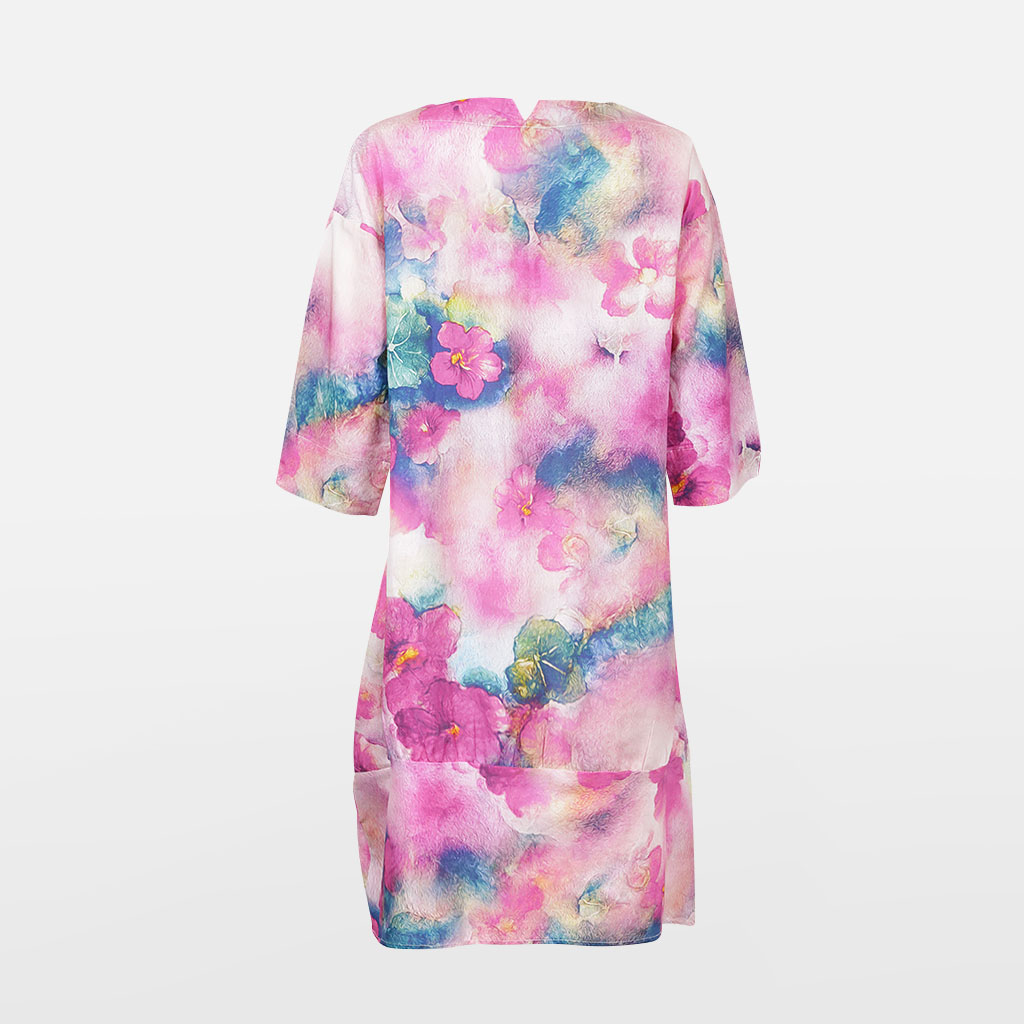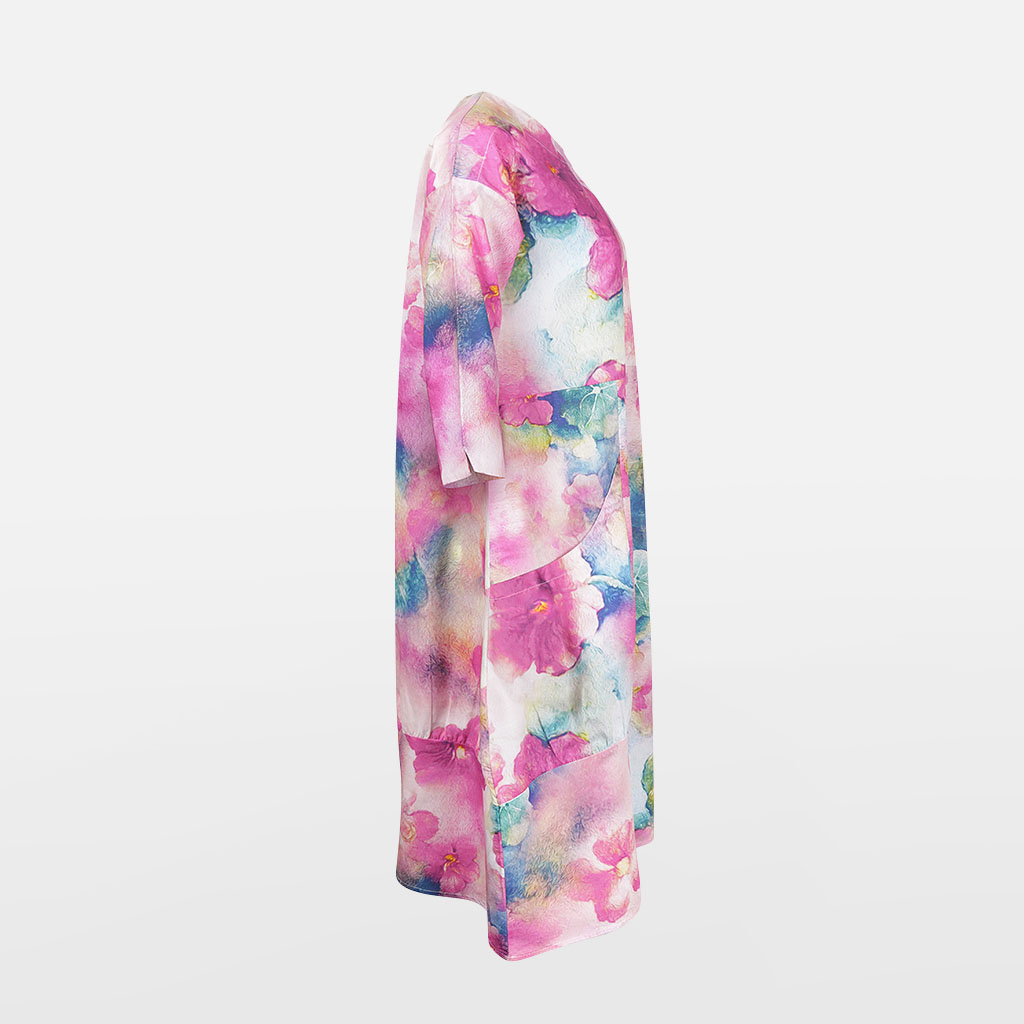 Accents of yellow, green, and white add depth and variety, reminiscent of sunlit bushlands and fresh greenery. Large, stylized pink flowers are scattered across the fabric, with discernible petals and centres that create a lively, cheerful vibe. The abstract background, with its swirling patches of pink, blue, and white, adds a dreamy, tie-dye or cloud-like effect. Bold, artistic, and full of life, this design perfectly captures the essence of summer with its bright and cheerful palette.
