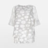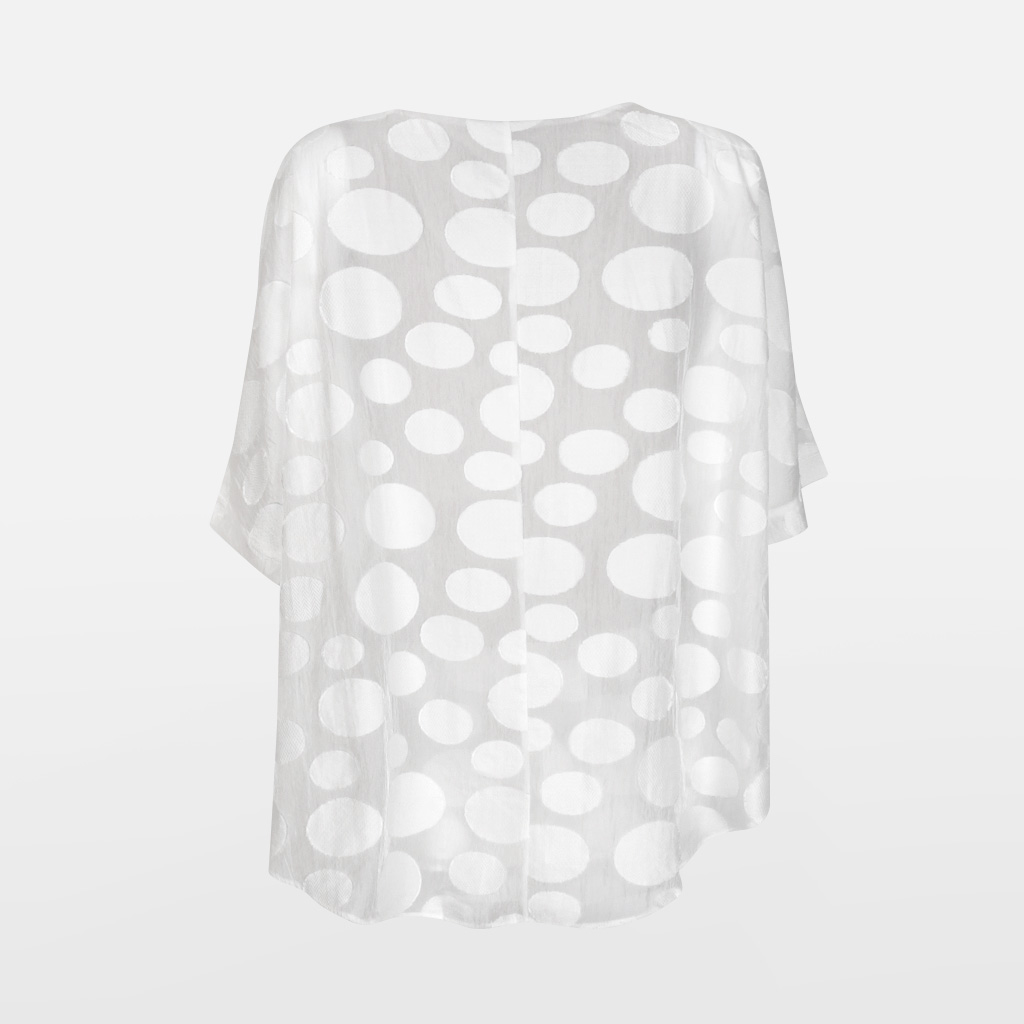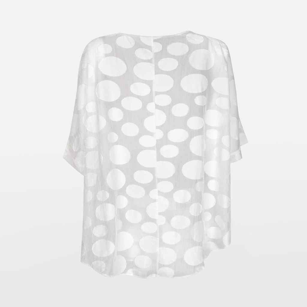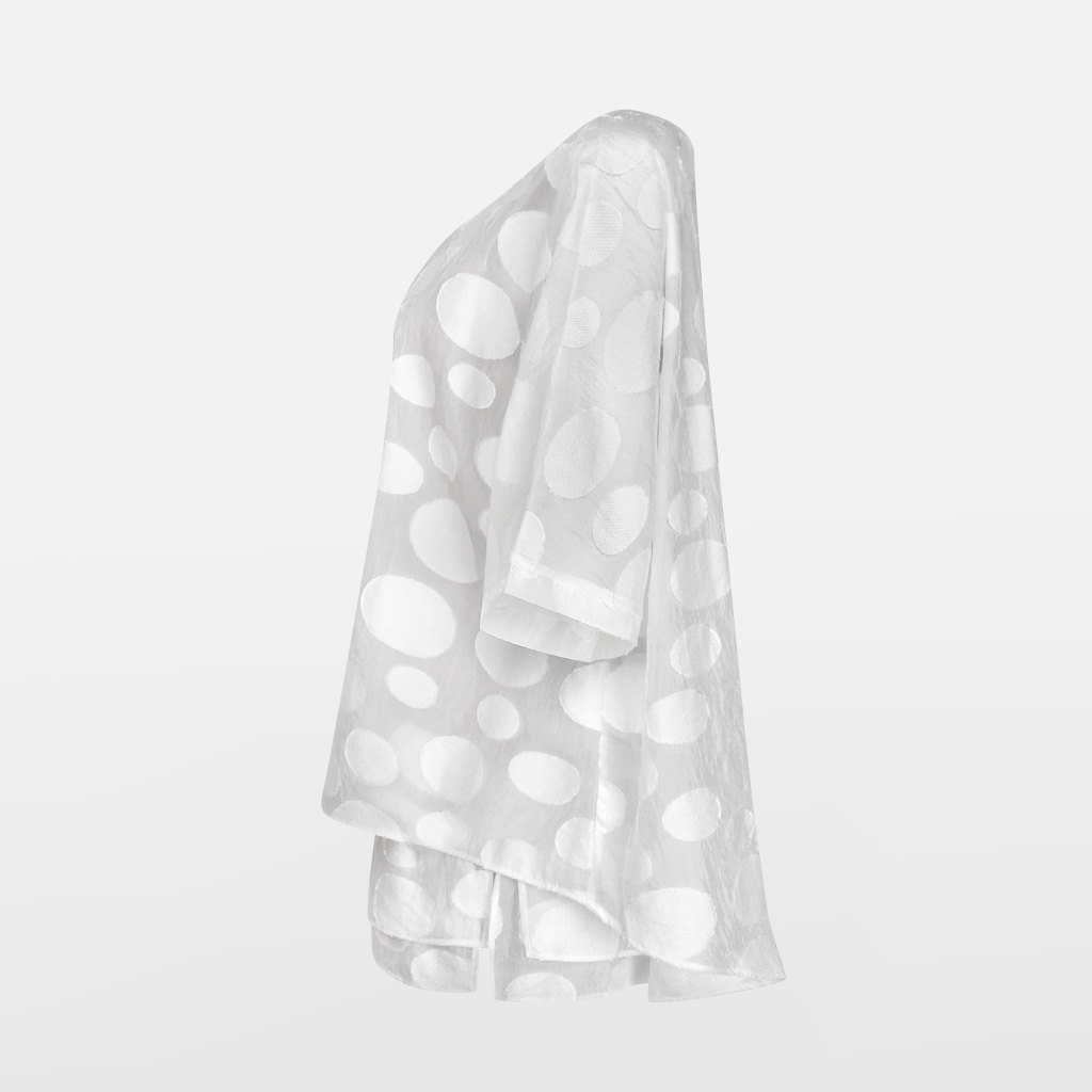 The defining characteristic of this material is its distinctive pattern. Dotted across the sheer silver overlay are clean white spots, each filled with colour to create a vibrant contrast against the silver
