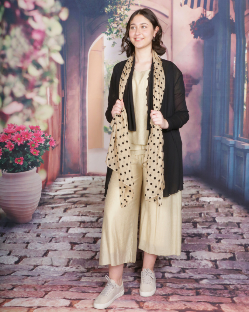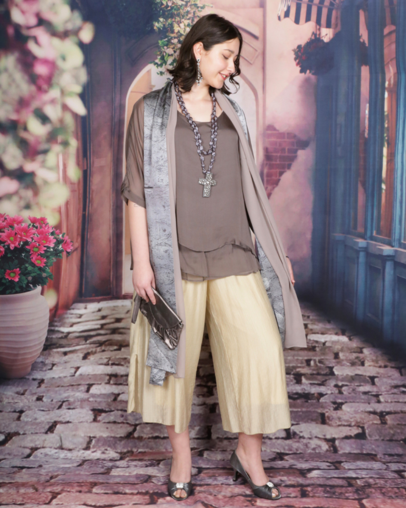For instance, if you’re wearing Nude bottoms with a granite top, consider adding a Nude-coloured necklace, headband, or earrings. Even a handbag carried in the crook of your arm brings that warm tone upward, creating a more fluid and flattering silhouette.