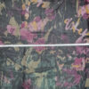 This fabric features a charcoal gray base adorned with a vibrant abstract floral pattern in shades of pink, magenta, orange, and soft beige. The design has a painterly, artistic quality, with dynamic brushstroke-like elements that add depth and movement. The material is lightweight and sheer, offering a soft, delicate feel and an elegant drape. Perfect for creating flowy garments, scarves, or overlays, this fabric combines bold colors with a sophisticated, artistic flair.
