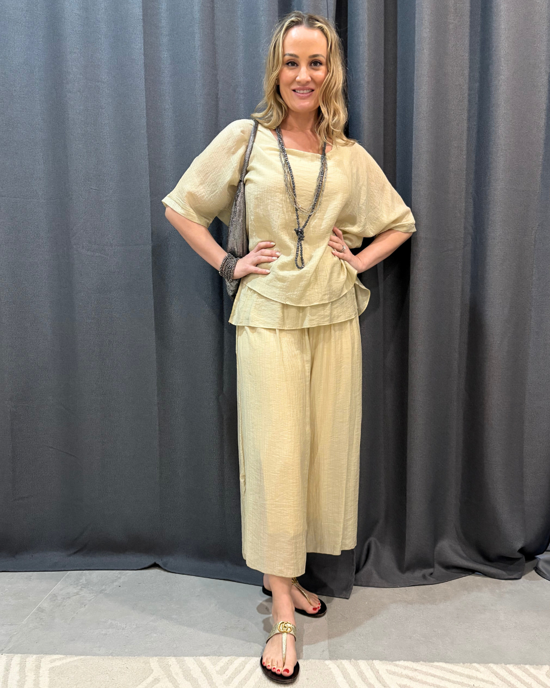 Step into effortless sophistication with the Desert Elegance Twinset, a perfect pairing of the Nude Abigail Layered Top and Nude Emily Pant 7/8 Length. This ensemble is designed for the modern woman who values comfort without compromising on style, making it an ideal choice for cruise wear or any stylish getaway.