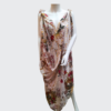 This fabric features a soft cream base adorned with an intricate floral and ornate pattern. The design includes vibrant red and yellow flowers, complemented by green leaves and elegant gold and brown scrollwork, adding a touch of sophistication. The material is lightweight with a smooth, silky texture, offering a luxurious drape that flows beautifully. Perfect for creating elegant dresses, scarves, or decorative pieces, this fabric exudes timeless charm and refinement.