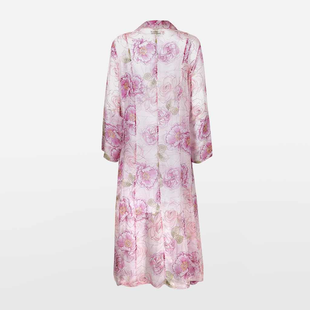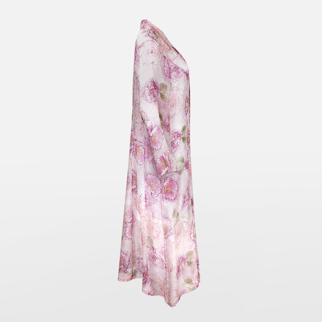 The Lilac Love Silk print is a delicate and ethereal design crafted from sheer 100% silk chiffon. This luxurious fabric features a harmonious blend of soft, romantic tones, including pastel lilac, blush pink, and gentle lavender, accented by vibrant splashes of fuchsia and deep plum. The floral pattern is brought to life with watercolour-style roses and lush green leaves, creating a dreamy, hand- painted effect. The lightweight, flowing nature of the silk chiffon enhances the fabric’s sheer quality, making it perfect for creating elegant, airy garments with a touch of sophistication.