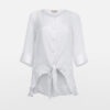 The “scoop neck, button front, tie jacket” – it’s a hip-length hangout shirt!