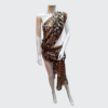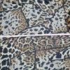 This fabric features a classic leopard print pattern with rich black and dark brown spots set against a warm beige and light brown background. Its sheer, lightweight nature gives it an airy and delicate feel, perfect for layering or creating flowy garments. The smooth texture enhances its luxurious appeal, making it ideal for scarves, blouses, or statement pieces that exude bold elegance.